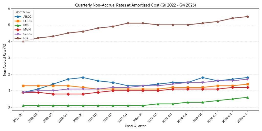 Currently the non-accrual rates are higher than in 2022 and keep rising. The reason for the recent spike is the residual loans from 2020-2021 low interest rate era. In 2023-2024 BDC’s could keep the non-accrual loans steady by restructuring or moving to payment-in-kind interest recognition, however by 2025 these efforts hit natural limitations forcing BDC’s to acknowledge the worst parts of the 2020-2021 vintages as non-accruals.