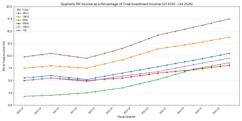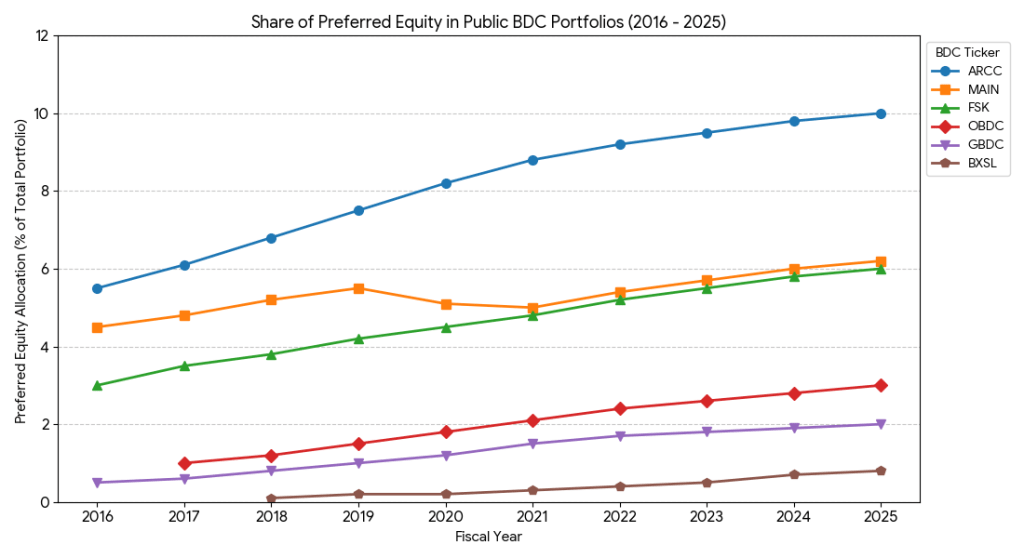 Preferred equity investments distort PIK ratios, as dividends on preferred stock are booked as PIK and do not indicate debt stress level. BDC’s increased preferred equity investments in recent years to improve return profiles for investors or as a restructuring tool to avoid loan write down. It increases risk of the portfolio by introducing equity risk into debt fund and potentially increasing borrowers debt capacity. In addition, preferred stock is usually less liquid and often dependent on equity sponsor liquidity event (exit).