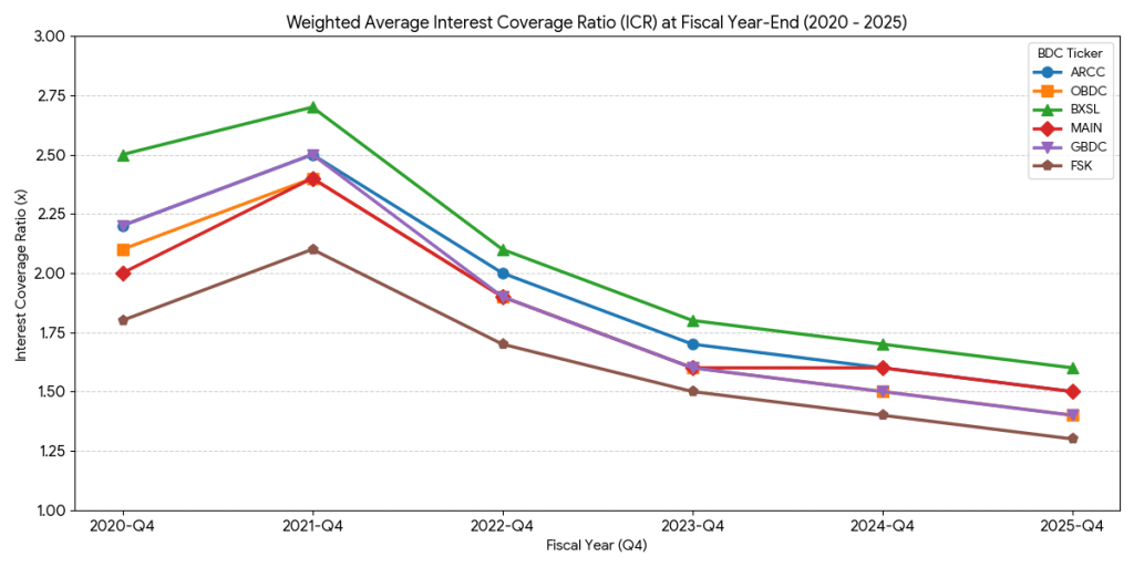 The decline of 2020-2021 vintage in portfolios and replacement by newer vintages, which reflected the new paradigm of high interest rates should naturally lead to reduction of non-accrual loans. However the loans from 2020-2021 that still are on the balance sheets of BDC’s are likely to be of poor quality, as indicated by increasing PIK recognitions and evidence of decrease in interest rate coverage (see below). Contractually the loans generated in 2020-2021 are coming to maturity in 5-7 years, so in 2026 a lot of them will need to be either refinanced or recognised as non performing.
