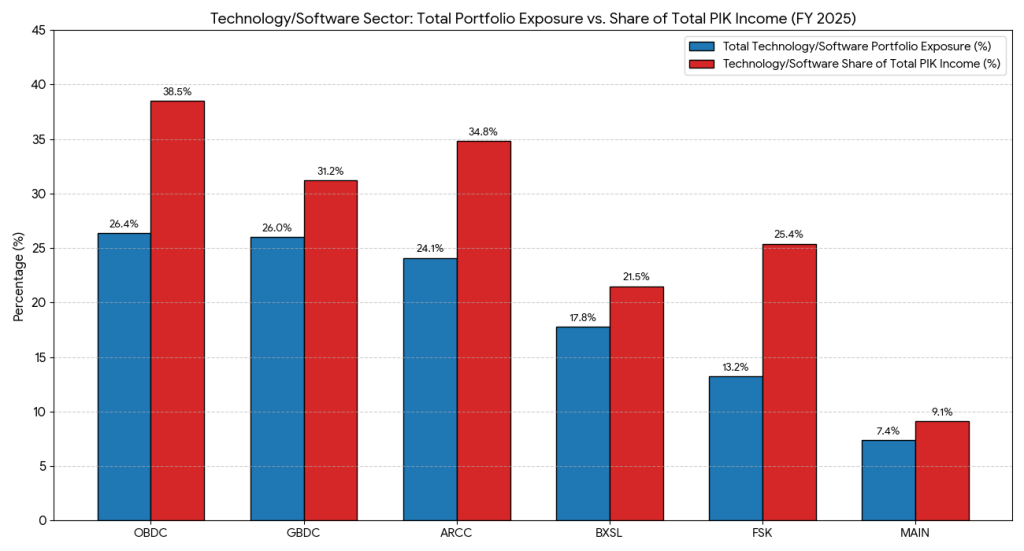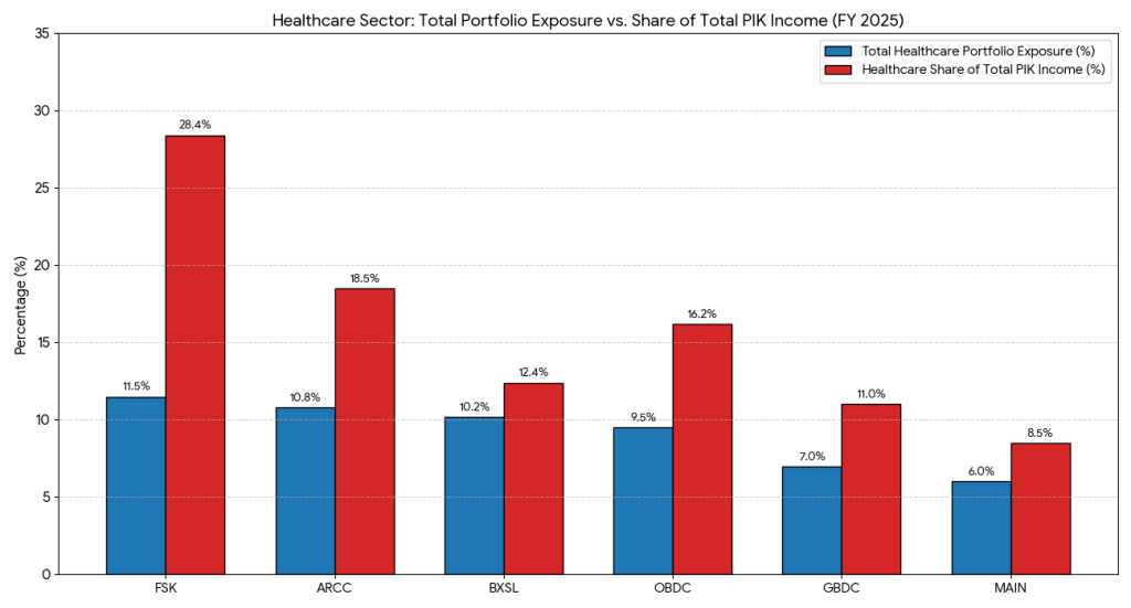 All largest public BDC’s have significant exposure to those three sectors, though to a different extent. The charts below illustrates exposure of the public BDC’s to healthcare and software sectors and share of these sectors in PIK. Large volume in PIK indicates potential unrealised defaults in the portfolio. As we know that both Healthcare and Software sectors face structural difficulties, the likelihood that PIK loans will transform into non-accruals is very significant.