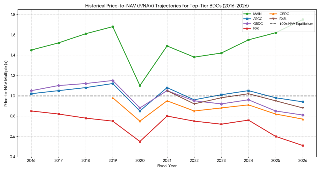 Share price is what the market perceives is the fair value of those assets. Regulations forbid raising capital at valuation below NAV, so in order to raise fresh investments public BDC’s need to trade at or above NAV. In times of stress, like now, public BDC’s trade below, should the situation continue it will limit the ability of managers relying on traded BDC’s to grow AUM, negatively affecting ceteris paribus EPS growth projections.