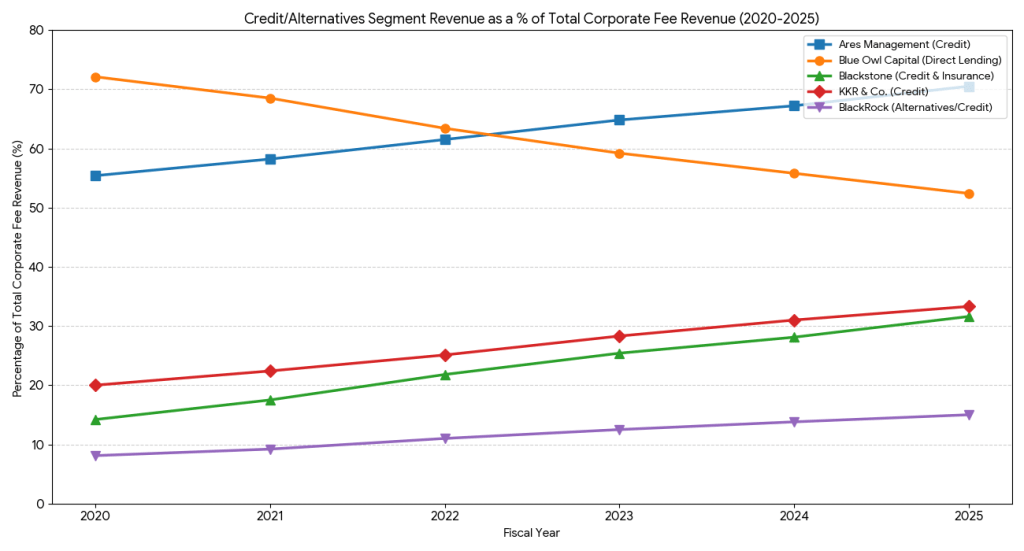 Appendix: How important are BDC’s and alternative credit vehicles for earnings of the parent management companies. Direct lending investment vehicles are main earnings sources for Blue Owl and Ares Management, but even for diversified providers such as Blackstone and KKR, credit investments constitute a third of their fee revenue.