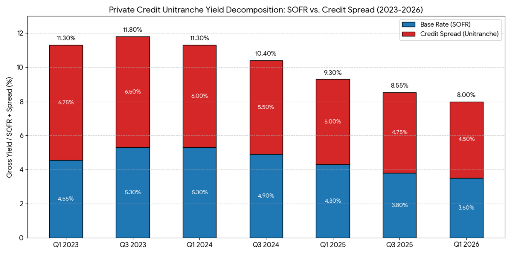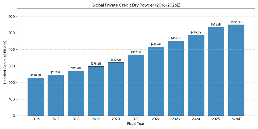 Private credit yield premium and dry powder in the system – private credit yield (measured as premium over SOFR) faces pressure, due to increasing flows into the asset class and limited ability to deploy. It means that the risk for new investors increases not only from lower risk compensation, but also from softer collaterals, higher LTVs, loan syndications and overall increasing pressure to deploy.