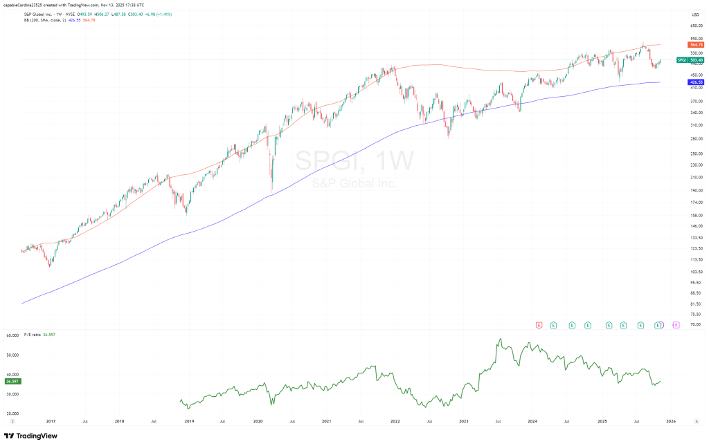 S&P Global stands out as a premier infrastructure provider in global finance, delivering essential credit ratings, market data, and benchmarks that are deeply embedded in the operations of banks, asset managers, and corporations worldwide. The company’s business model is built on highly recurring revenues from ratings, data subscriptions, and index licensing, supported by strong pricing power and high customer retention. Its entrenched position is protected by regulatory requirements, a trusted brand, and massive switching costs, creating a durable competitive moat. Financially, S&P Global boasts industry-leading operating margins (around 40%), robust free cash flow, and consistent double-digit EPS growth. With the stock currently trading below its historical valuation averages, S&P Global offers investors a rare combination of stability, profitability, and long-term compounding potential—making it an attractive buy for those seeking exposure to the backbone of modern financial markets.